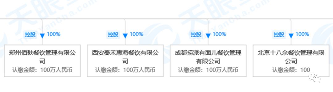 天眼查显示,十八汆、饭饭林和秦小贤的商标归北京十八汆餐饮管理有限公司所有,捞派有面儿归成都捞派有面儿餐饮管理有限公司,佰麸私房面属于郑州佰麸私房面餐饮管理有限公司,新秦派面馆属于先秦禾惠海餐饮有限公司,这四家公司都登记在海底捞旗下的新派(上海)餐饮管理有限公司100%控股,认缴金额均为100万。几家公司由海底捞员工出任法人,实际控制人和最终受益人为海底捞总公司。