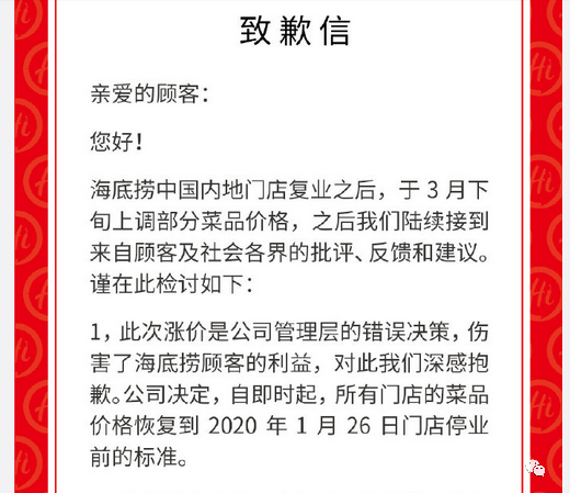 此外,海底捞在2020年4月宣布涨价,但是这次涨价遭到了强烈的舆论反扑,海底捞很快将价格恢复到疫情前水平,道歉信中称涨价是管理层的“错误决策”。