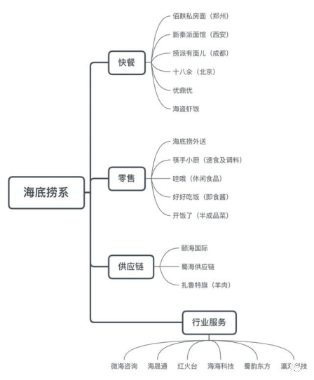 几家餐厅的产品研发、采购、生产、品保、仓储、运输由蜀海供应链提供;餐厅内的智能化服务设备都由瀛海智能设计生产;数字化服务商为红火台网络科技有限公司;门店装修交给蜀韵东方。