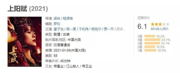 2021年1月,群星主演的开年大剧《上阳赋》口碑扑街,剧集现已播出近一半,遗憾的是,群嘲近半月后,《上阳赋》口碑并未“真香”翻盘,豆瓣评分止步6.1。