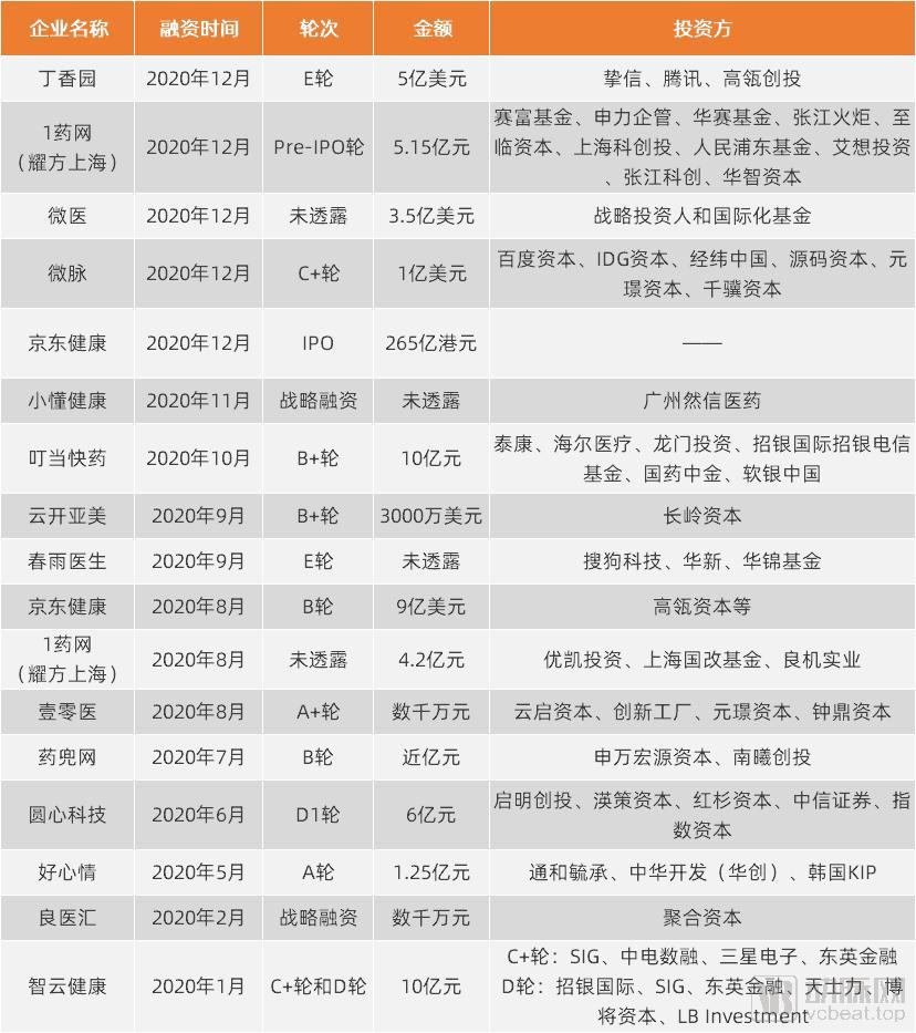 从融资详情来看,2020年大额融资集中在少数企业。其中,丁香园、京东健康等已实现规模化盈利。丁香园5亿美元融资将用于强化专业壁垒,探索更多医疗健康场景,打造更多专业可信、连续整体的系列健康产品。京东健康上市募集资金将用于进一步扩大用户群体,加强医药和健康产品的供应链能力,扩张在线医疗健康服务,加强技术赋能解决方案并持续创新。
