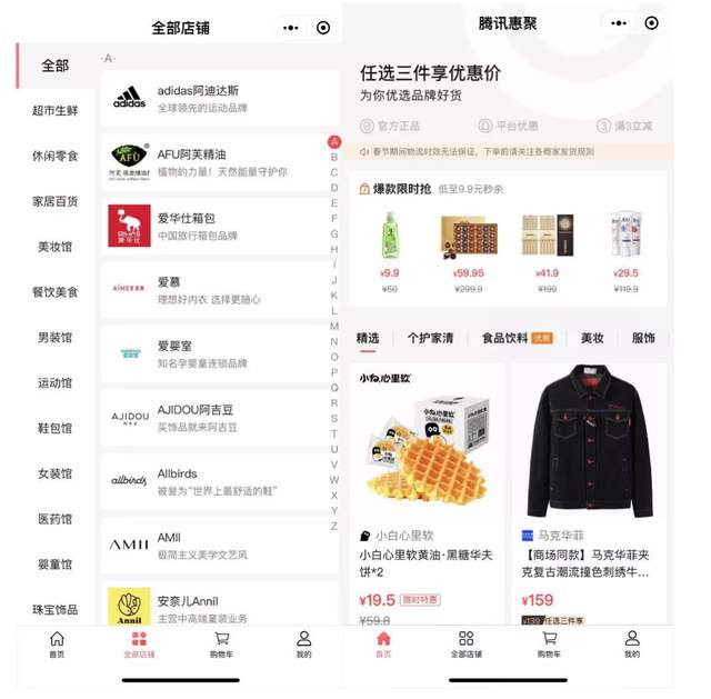 在产品呈现上,腾讯惠聚的第二个tab栏“我的店铺”,与腾讯智慧零售小程序是相同的,不同的是在产品首页,腾讯智慧零售小程序以展示店铺为主,腾讯惠聚以展示商品为主,另外,腾讯惠聚主打的两项互动是,“爆款限时抢:低至9.9元秒杀”和“任选三件优惠价”。