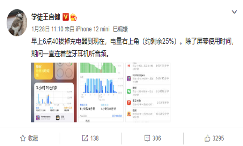 接着,iPhone的续航问题也遭质疑。美国硬件网站Tom'sGuide的测试结果显示,开启5G后,iPhone12的续航时间会锐减,比4G模式要少两个小时左右。演员王自健甚至发微博称,从早上6:48拔掉充电器开始,截至上午11:10,除了屏幕使用时间外,期间一直在连接蓝牙耳机听音频,而iPhone 12mini的耗电量为75%。