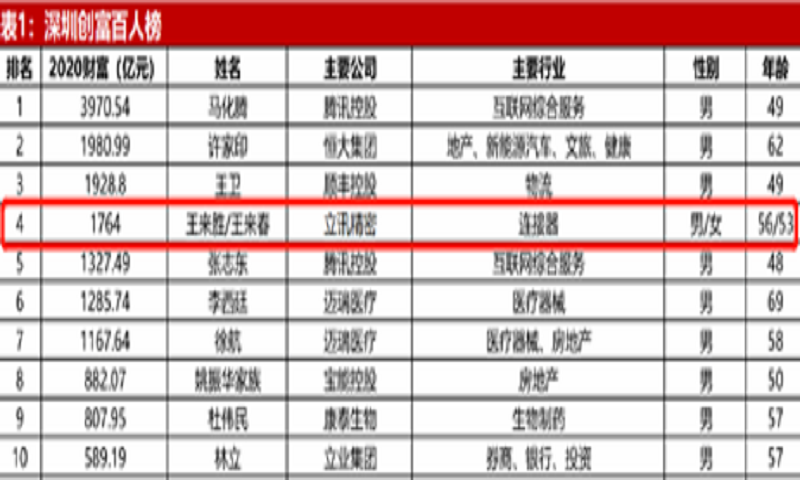2011年7月至2020年10月,立讯精密的股价涨幅超40倍,而公司的女老板王来春,亦从富士康普通打工妹华丽蜕变为首屈一指的深圳女富豪。
