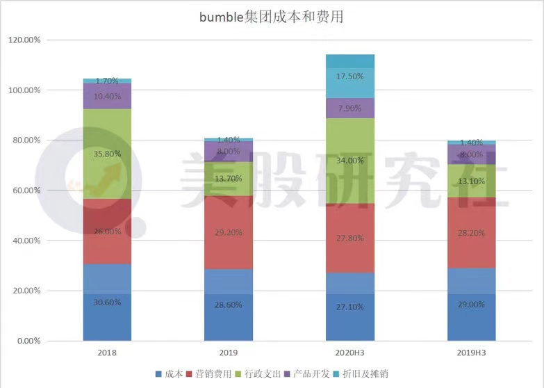 为了追求用户增长,Bumble投入的营销费用同比增长不少。据Bumble招股书显示,2020年前9个月Bumble集团净亏损8412万美元。从费用上来看,2019年营销费用从2018年的9,360万美元增加至1.429亿美元,增幅52.7%,2020年前三季度的营销费用为1.045亿美元,2019前三季度营销费用为1.023亿美元,可以看到Bumble集团的营销费用连年升高。