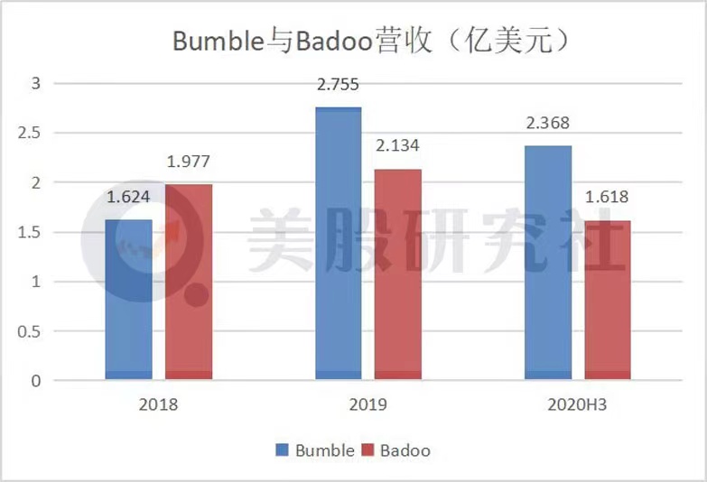 Bumble集团有Bumble和Badoo 两个app业务,其中Bumble在2018年营收1.6亿,2019年营收2.75亿,同比增长69.7%, 2020年前三季度营收2.3亿并占整个集团营收的一半以上。同期Tinder营收8.5亿,同比增长30%。Bumble的营收增速要远远大于Tinder。