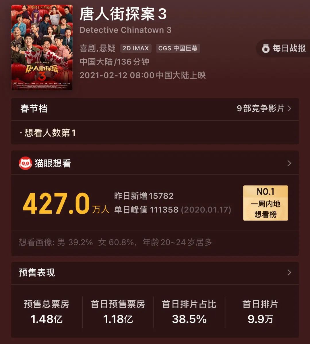 虽然今年春节档首周末预售成绩,不及去年(七天预售周期)的开局势能,与2019年同期数据也略逊一筹,但在疫情黑天鹅的阴影下,以及《唐探3》单片破纪录的预售表现,该预售成绩已经为行业提供弥足珍贵的信心。