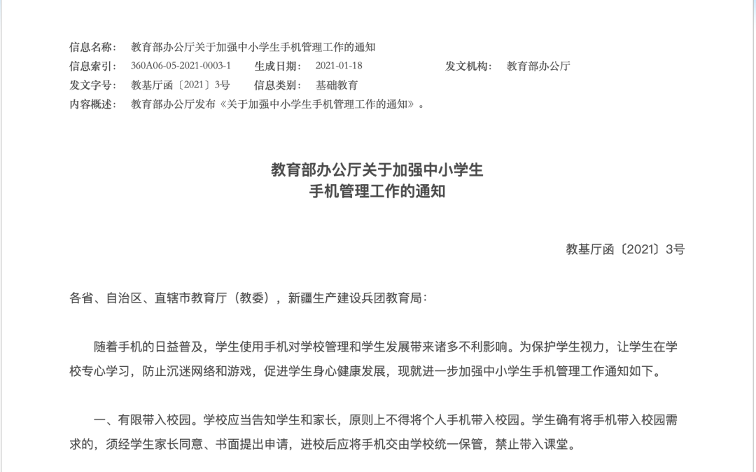 2021年2月1日,教育部办公厅印发《关于加强中小学生手机管理工作的通知》(以下简称通知),提出中小学生原则上不得将个人手机带入校园,学生确有将手机带入校园需求的,须经家长同意、书面提出申请,进校后应将手机交由学校统一保管,禁止带入课堂。