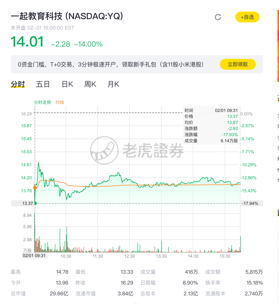 昨日美股开盘,一起教育科技股价大幅跳水,盘中跌幅一度超过17%。截至收盘,一起教育股价跌幅稳定在14%,报14.01美元,市值26.86亿美元。凤凰网科技就《通知》影响采访一起教育科技,截至发稿未获回应。
