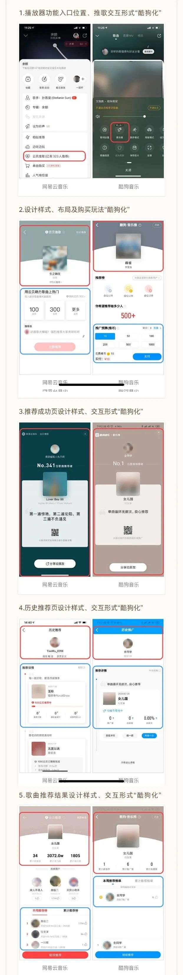 网易云音乐的配图长文名为《关于给酷狗“山寨办”团队申请年终奖励的建议》,以反讽口吻历数了酷狗音乐“山寨办”成立以来,一直以将网易云音乐新功能酷狗化,如像素级致敬网易云音乐“一起听”功能、“山寨办”初战致敬网易云音乐“云贝推歌”。