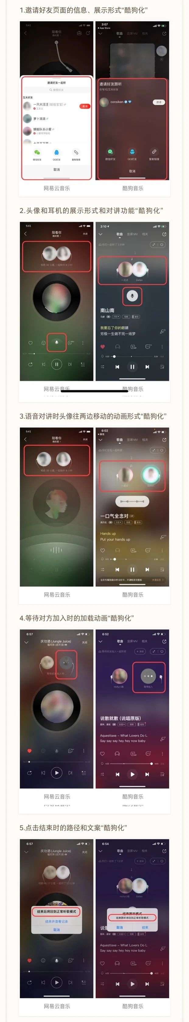 从网易云音乐贴出的对比图可以看到,酷狗的“跟听”不仅在功能和理念方面与网易云的“一起听”相似,从邀请好友页面的展示形式、语音对讲时头像往两边移动的动画、等待对方加入的加载动画,到点击结束时的路径和文案都十分类似。