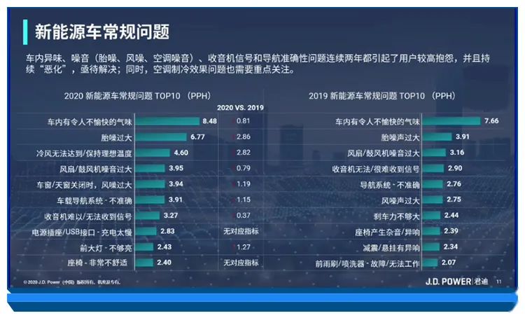 根据J.D.Power发布2020年中国新能源汽车体验研究报告显示,车主反馈新能源汽车存在车内异味、胎噪、收音机无法接收信号、车载导航系统不准确等问题,而此外,在2020年,车主们又反馈出了电源插座/USB接口充电慢、座椅不舒服等新问题。