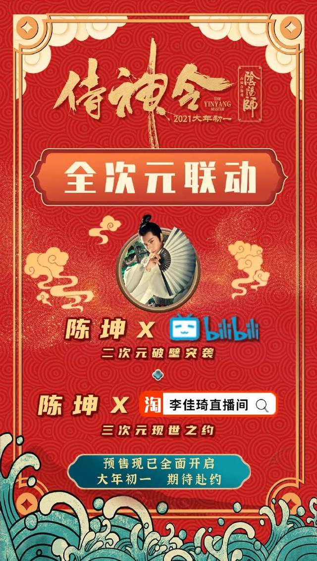 《侍神令》同样派出主演陈坤进入头部主播的直播间,配合着#陈坤李佳琦直播##陈坤示范晴明眼神杀#的微博话题,李佳琦直播间内《侍神令》30万张观影福利券售罄,累计观看达1265万。