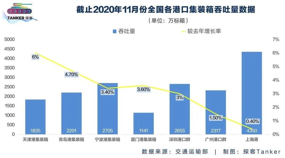 交通运输部发布的全国各港口集装箱吞吐量的有效数据显示,截止2020年11月份,天津港集装箱吞吐量1835万标箱,比去年增长超过6%;青岛港集装箱吞吐量2201万标箱,比去年增长超过4.7%;宁波港集装箱吞吐量2705万标箱,比去年增加3.4%;厦门港集装箱吞吐量1141万标箱,比去年增加3.6%;而珠江三角洲的深圳和广州两个港口群,集装箱吞吐量分别达到2655万和2317万标箱,比去年增长超过3%和1.5%。