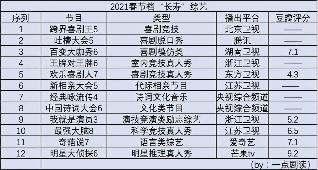需要注意的是,因“疫情”再次复发,电影院上座率能否如期坐满,成为当前市场最为关注的问题。而在去年,因疫情宅家运动的相关规定,综艺、剧集市场屡屡迎来收视新高,创近十年春节档电视收视率平均值最高。