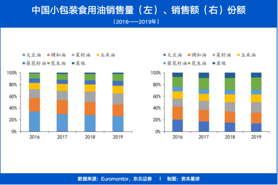 从分类来看,小包装食用油市场仍是大豆油、调和油的天下,但所占份额在不断降低,从2016年的34%、23%降至2019年的26%、20%。菜籽油、玉米油等更有营养、价格更贵的油种开始发力,逐渐扩张销售份额。