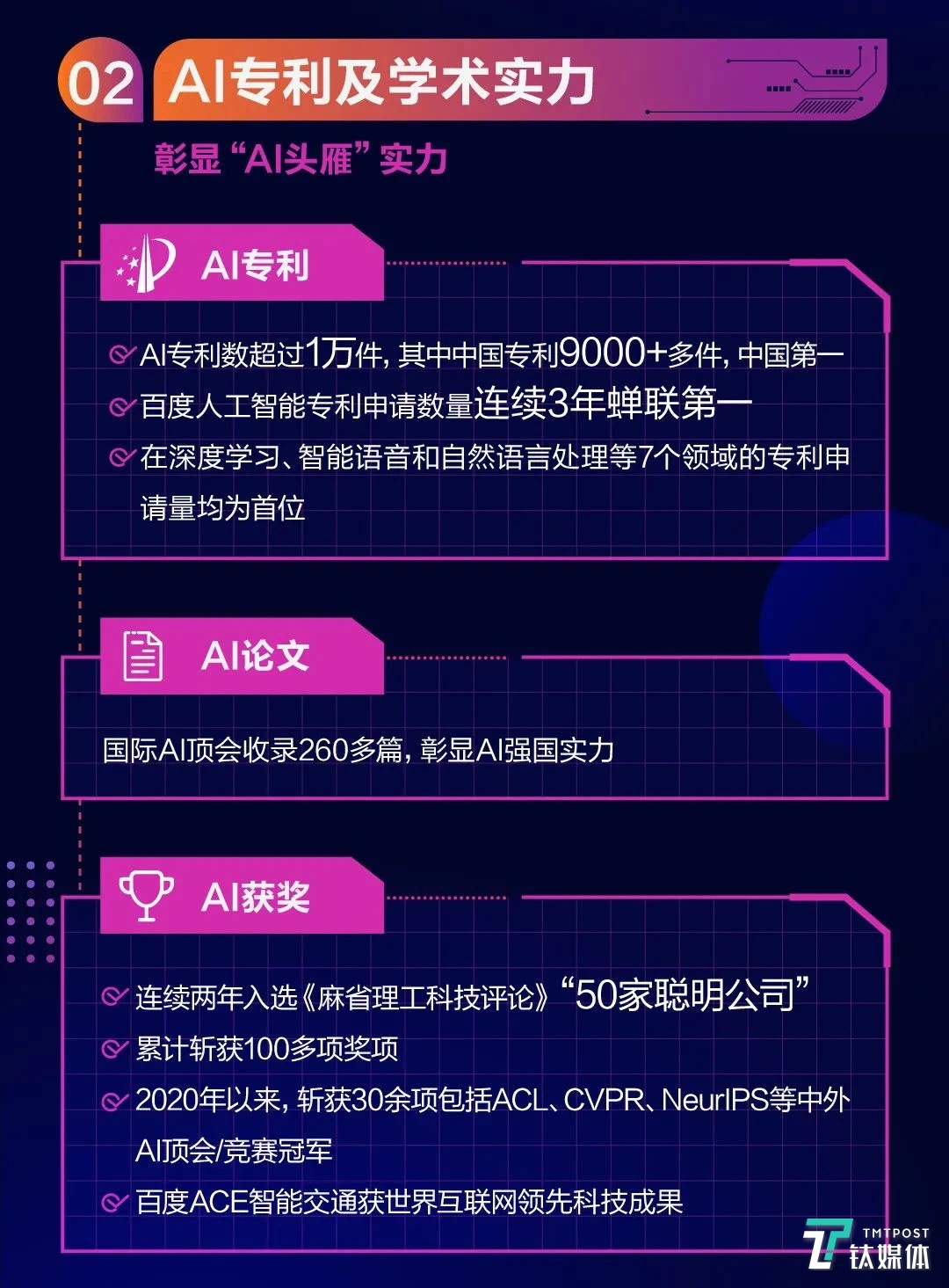 2017年的重要性前面已经说过,而到了2020年,在人工智能专利申请量和授权量方面,百度分别以9364件专利申请和2682件专利授权处于第一位,并有260多篇论文被国际顶级会议收录。百度研发人员占比高达61%,AI技术团队实力雄厚,百度CTO王海峰、百度研究院David Forsyth 、Mark Liberman等科学家成为AI界的世界级专家。