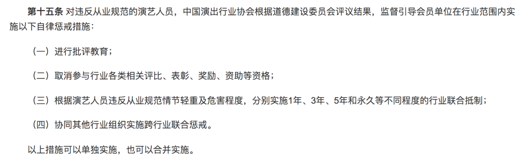 除了明确假唱监管问题,《办法》首次确立了对于劣迹艺人的惩戒措施。根据该规定的第十五条,违反从业规范的演艺人员可能面临的处罚有:被批评教育,被取消参与行业各类相关评比、表彰、奖励、资助等资格,被实施1年、3年、5年或永久等不同程度的行业联合抵制。
