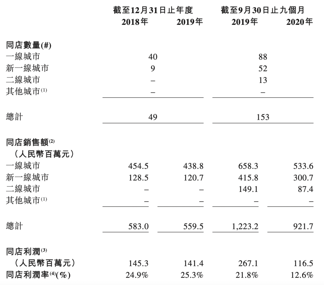 其2018年、2019年及2020年1-9月单店日均销售额分别为3.07万、2.77万和2.01万元,呈现持续下降趋势,
