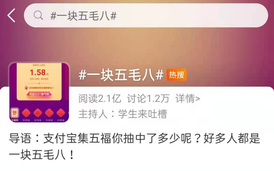 互联网大厂春节营销搞得热闹,几十亿的红包战叫地响亮,开奖后明面上几家欢喜几家忧,实际上大多数人也分不到多少钱,就拿咱传统活动支付宝集五福来说吧,有多少人是一顿操作猛如虎,最后得了一块五?