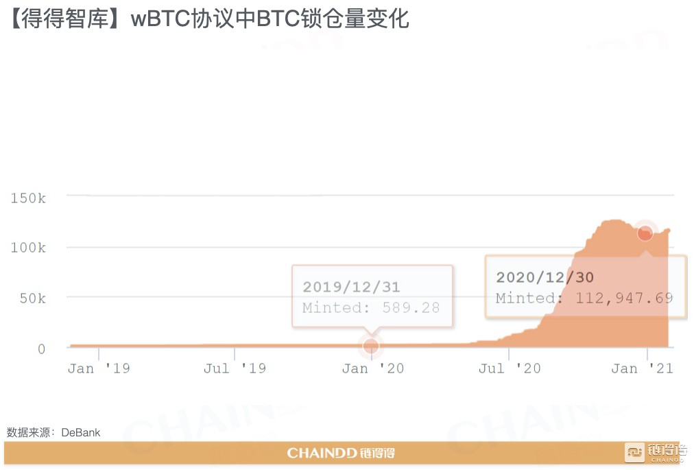 根据WBTC官网数据,2020年末WBTC协议中的比特币数量为112,947枚。