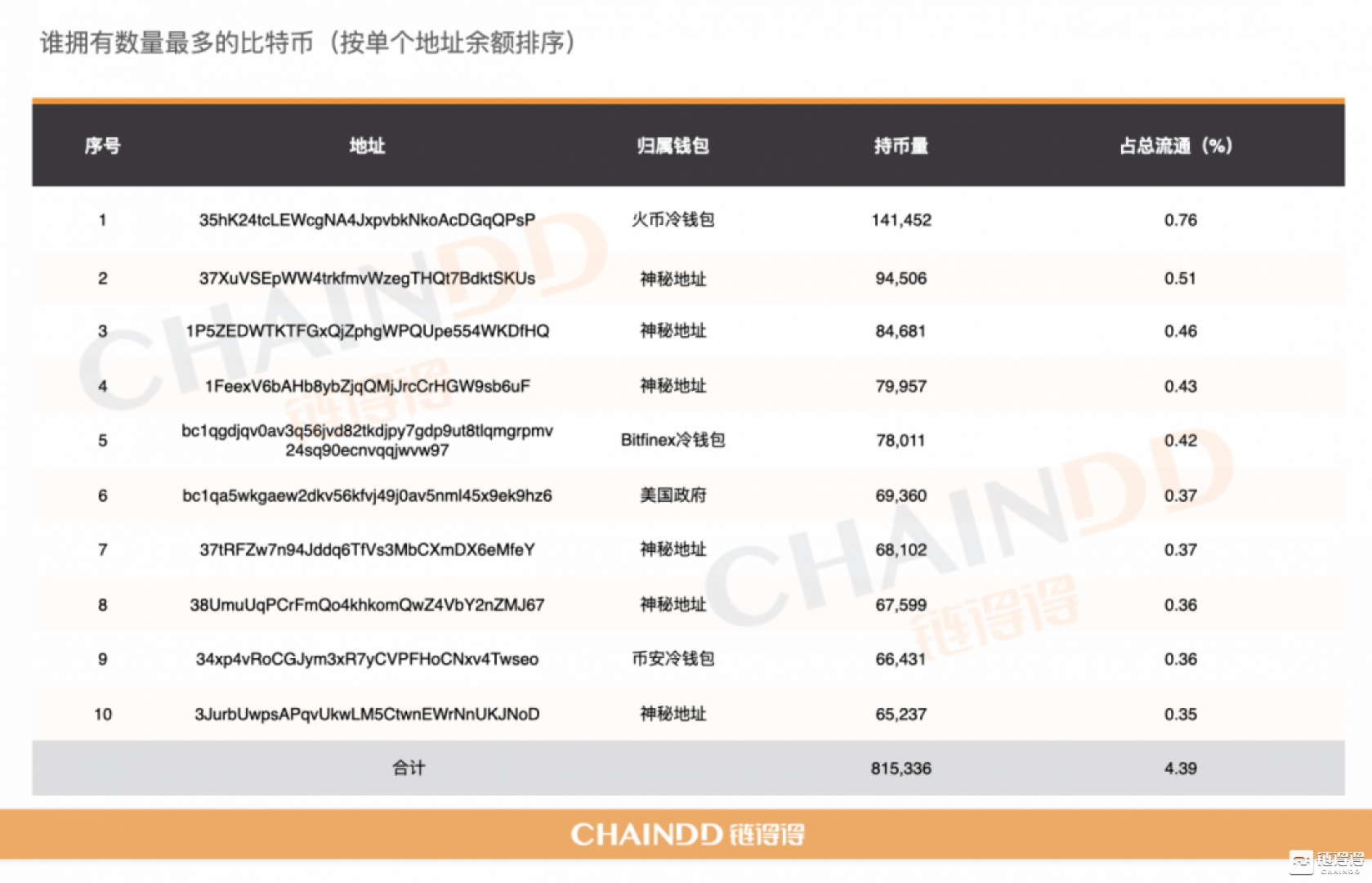 - 以BTC链上单个存储地址最新余额数量为主体的排行。