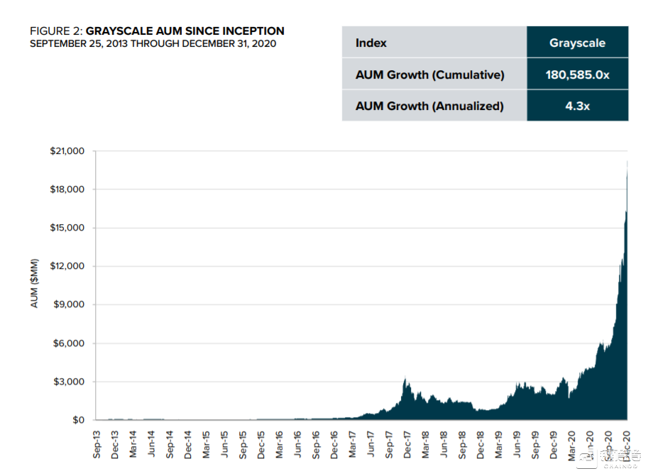 暴发期:2020年,2020年灰度的管理资产规模增加了180亿美金;其中比特币信托资产规模增加了175亿美金。