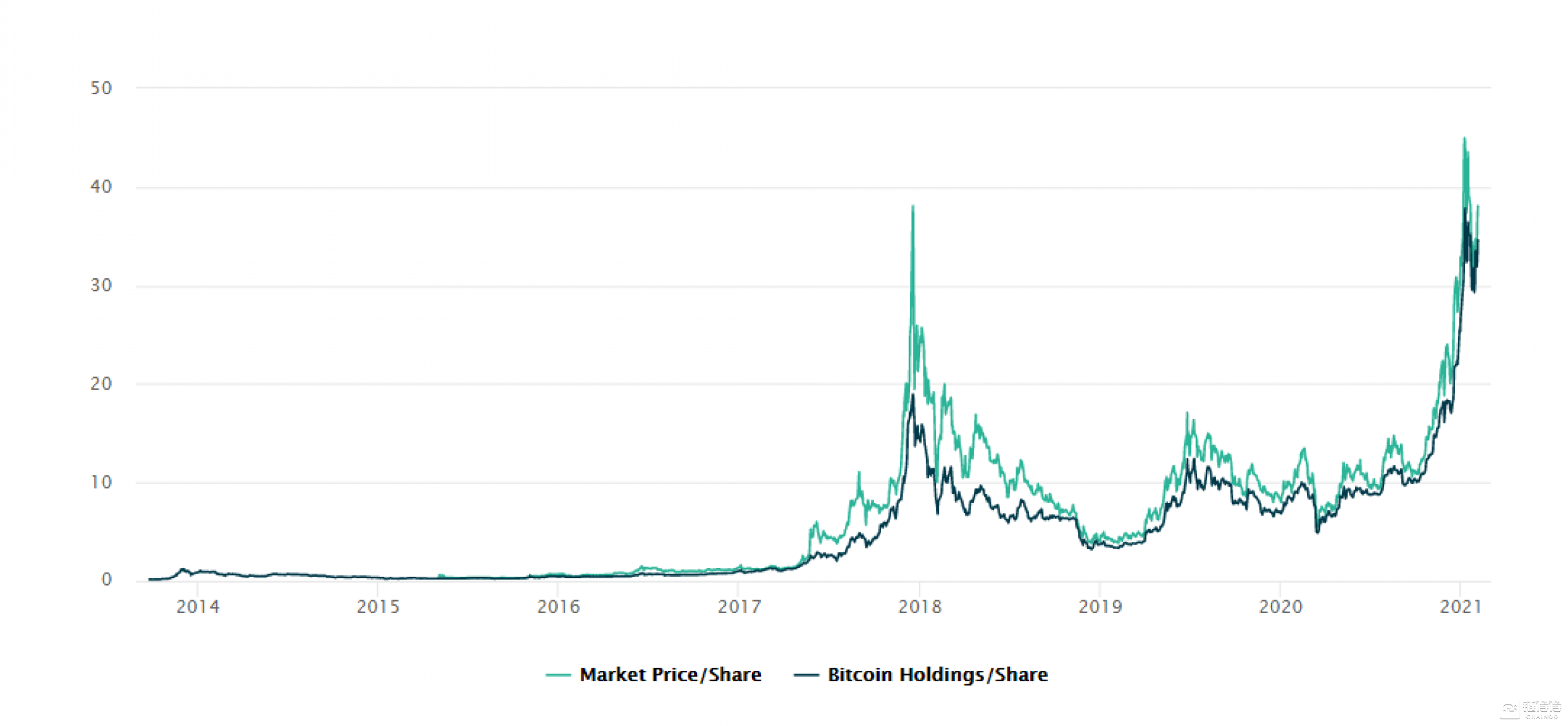 上文提到,GBTC几乎总是以溢价于BTC的价格在二级市场进行交易。如下图所示,绿色线条表示GBTC的市场价,而黑色线条表示每股GBTC相应数量BTC的价格。可以看到,过去5年,绿色总是高于黑线,这意味着GBTC总是以相对于BTC正溢价的价格在二级市场上交易。2014到2020年,GBTC平均溢价幅度为38%,最高的时候达到132%,对于合格投资者来说套利空间十分可观。