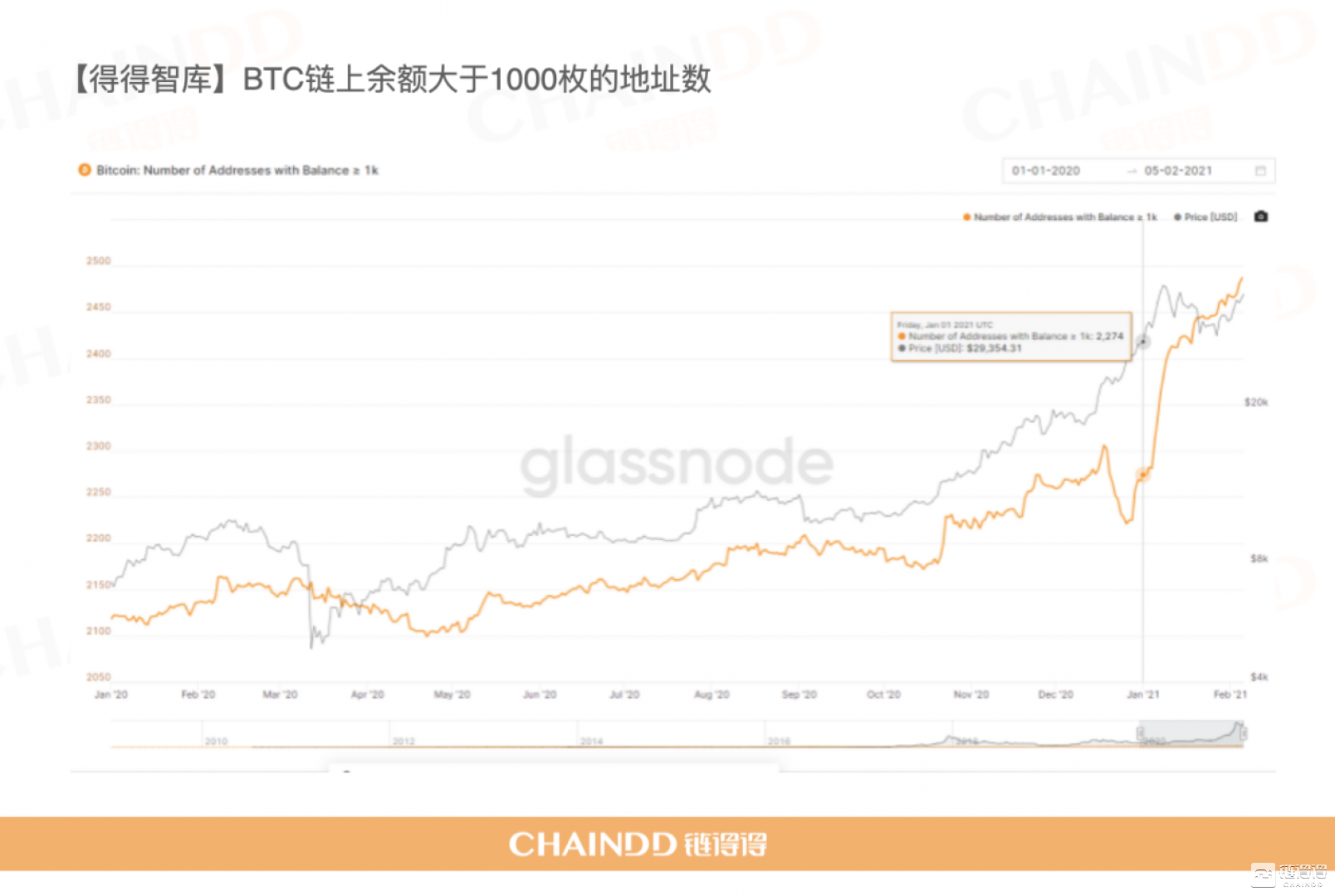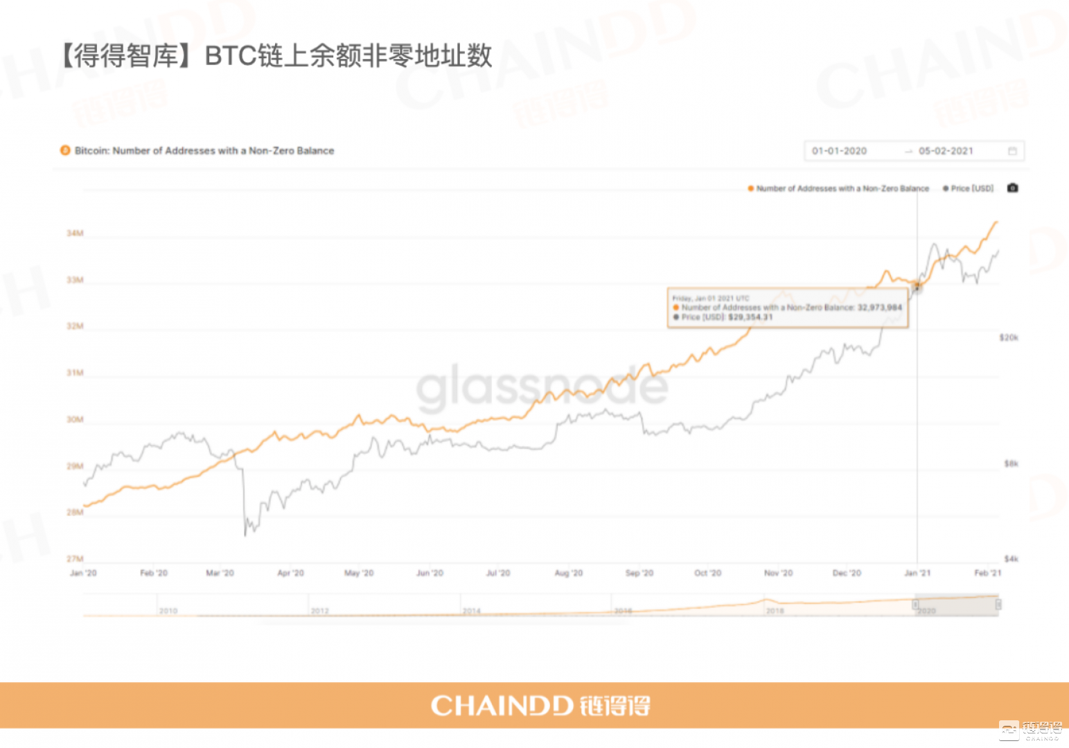 Glassnode网站数据显示,2020年初BTC链上余额非零地址数为2820万,而在年末这一数字增加到了近3300万,从下图可以看出,链上非零地址数(橙线)几乎随着价格(灰线)的增长而增长,而过程中短暂的价格回落也没有影响非零地址数的增加。这一趋势也延续到了2021年,在新年的第一个月,链上非零地址数又新增近150万个。