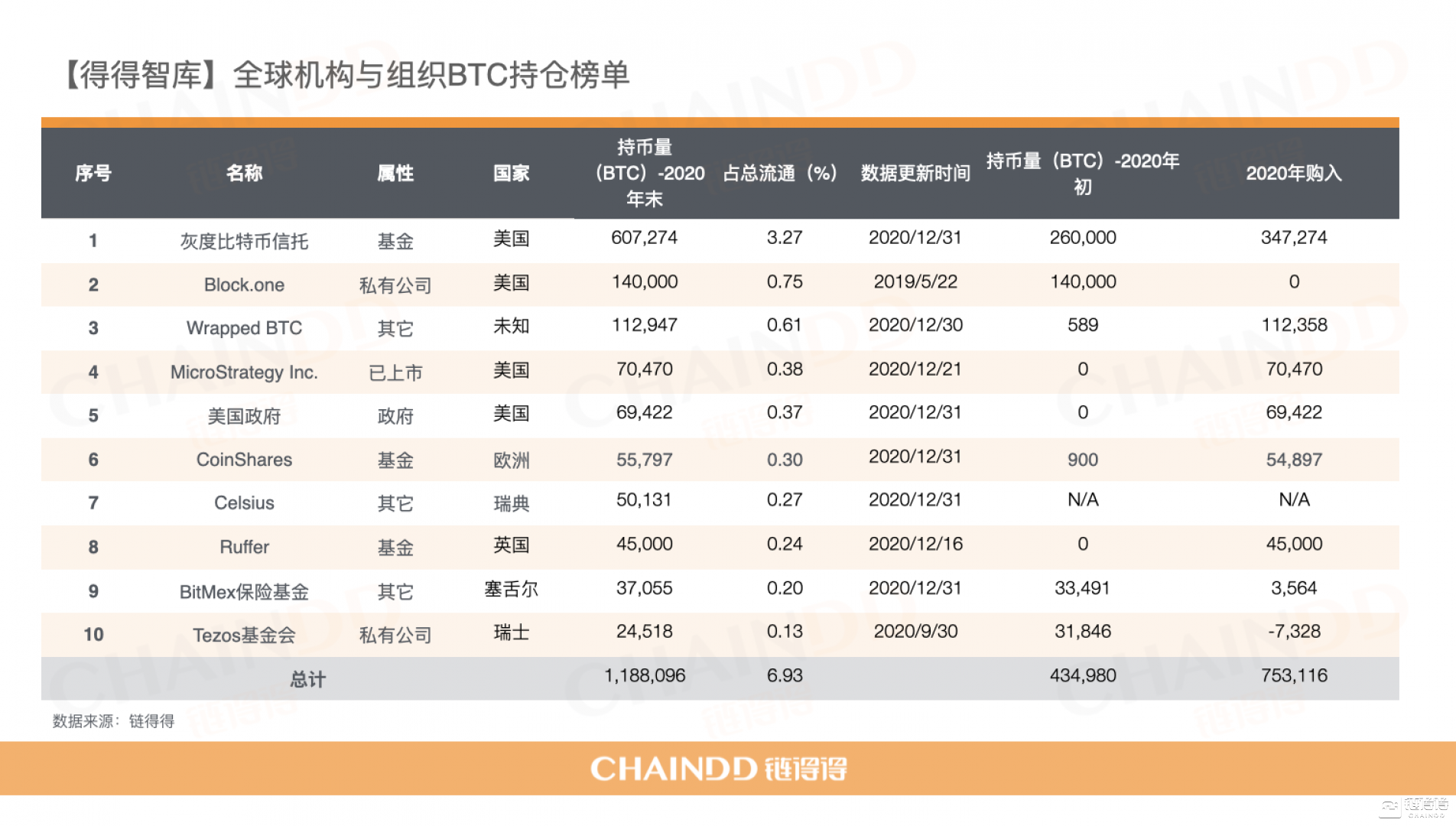 最新数据显示,2020年末,这十大机构的总持仓达到了118.8万枚比特币,占目前BTC流通量的6.39%。而根据能搜索到的数据,在2020年年初,这10大机构的总持仓量为43.5万,一年内总增长量为75.3万枚BTC。