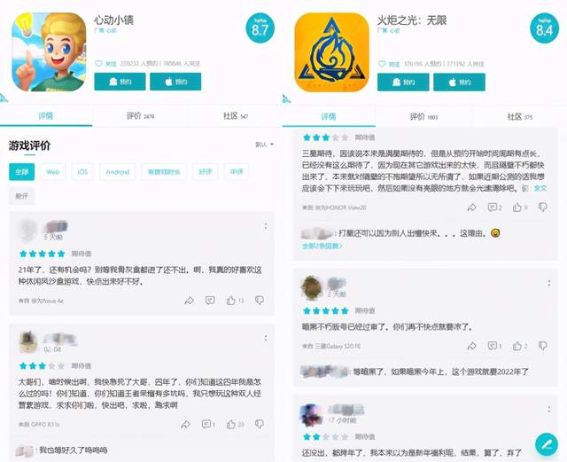 然而至2021年2月,我们在TapTap平台搜索《火炬之光:无限》和《心动小镇》,发现这两款产品仍处于用户预约阶段,没有可供玩家体验的版本。翻到评价页,这两款手游的近期用户评价也都是非常一致的催促声音。