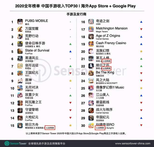 在数据情报平台Sensor Tower发布的2020年度中国手游海外收入TOP30榜单中,我们在《明日方舟》、《第五人格》、《明日之后》、《仙境传说RO》四款游戏的发行商处都能看到心动公司的影子。然而为何这些头部游戏的名字,没有一个出现在心动公司收入贡献排名前五的名单中呢?
