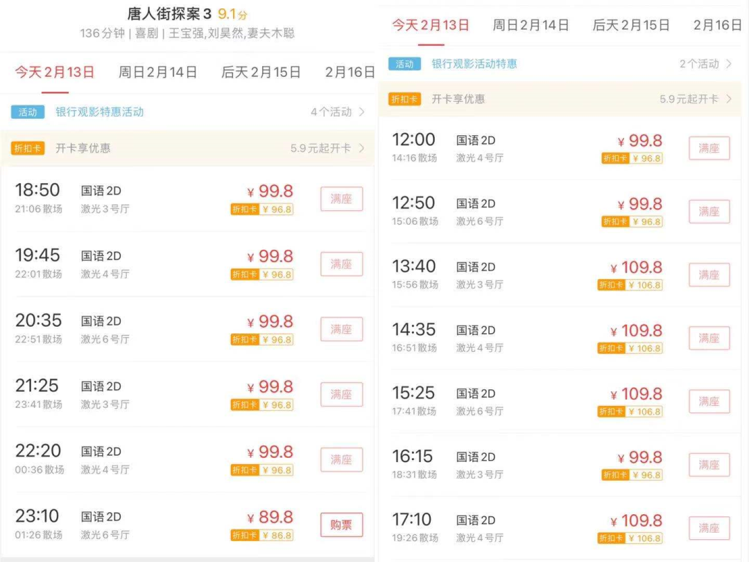 事实上,今年春节,北上广深等一线城市好地段高档影院一张普通2D电影票的票价60-80多元成常态,《唐探3》《刺杀小说家》这种热门视效大片票价更贵,IMAX影厅票价都是100元以上。即使是三四线城市,黄金地段影院的票价也普遍在40-70元左右,均比平时大幅上涨。