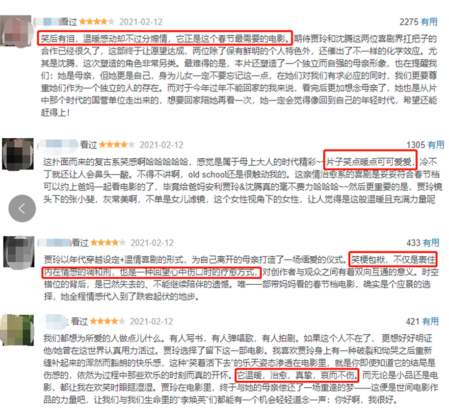 很多观众在影评里给出极高的评价,“笑后有泪,温暖感动却不过分煽情”“笑点暖点可可爱爱”“笑点包袱是一种回望心中伤口时的疗愈方式”,还有网友表示看完影片后,“想给我妈打个电话,告诉她等等我,过两天就回去看她了”。