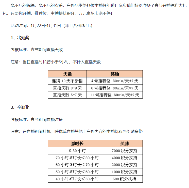 “主播在节假日期间开播,每天播够足够长的时间,就能获得推荐位或是其他奖品。”周红表示,推荐位是主播提高曝光率的最直接的手段,对主播而言意义重大,然而,主播获取推荐位的机会十分有限,除了靠MCN机构扶持之外,就只有通过平台举办的各种活动来获得了。