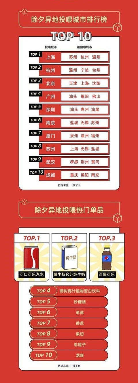 据饿了么和大润发联合推出的《2021春节就地消费报告》可知,一线城市的异地消费者订单显著增多,牛奶礼盒、水果礼盒成为异地投喂的热门品。很多人在备注里留言:“过年回不了家,为父母亲点的”,还嘱托商家“要挑品质好的”“要送货上门”。