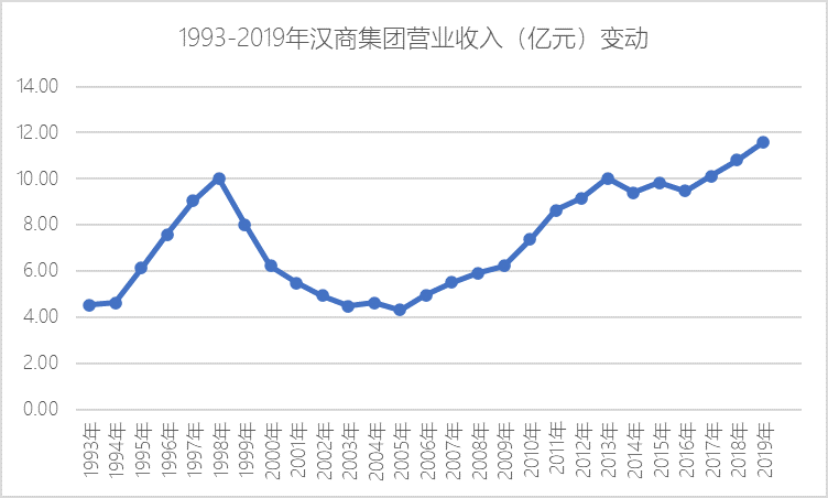 2005-2013年,汉商集团营收从4.33亿元增长到10.03亿元,年复合增长率11.1%。但2013-2019年,其营收年复合增长率下降至2.4%,甚至没有跑赢同期通货膨胀率。