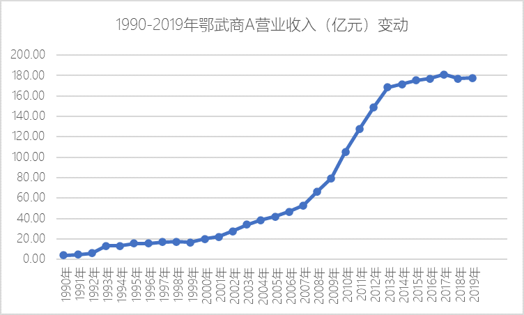 1990-2013年,23年间鄂武商营收翻了42倍,年复合增长率17.5%。但从2013年开始不复之前高速增长的势头,营收基本维持在170亿元上下。