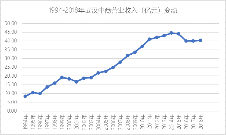 1994-2011年,17年间武汉中商营收翻了近5倍。但自2011年站上40亿元后,其营收增长放缓,没有超过45亿元(不包括2019年营收数据,内含居然之家营收)。