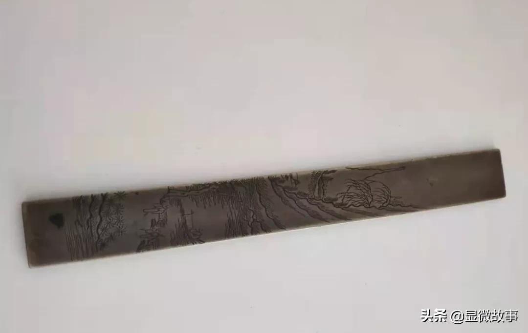 我家有一把约为20公分长的铜制戒尺,正面雕有精细的山水画,背面则非常平整,拿在手上有一种非常扎实的厚重感。