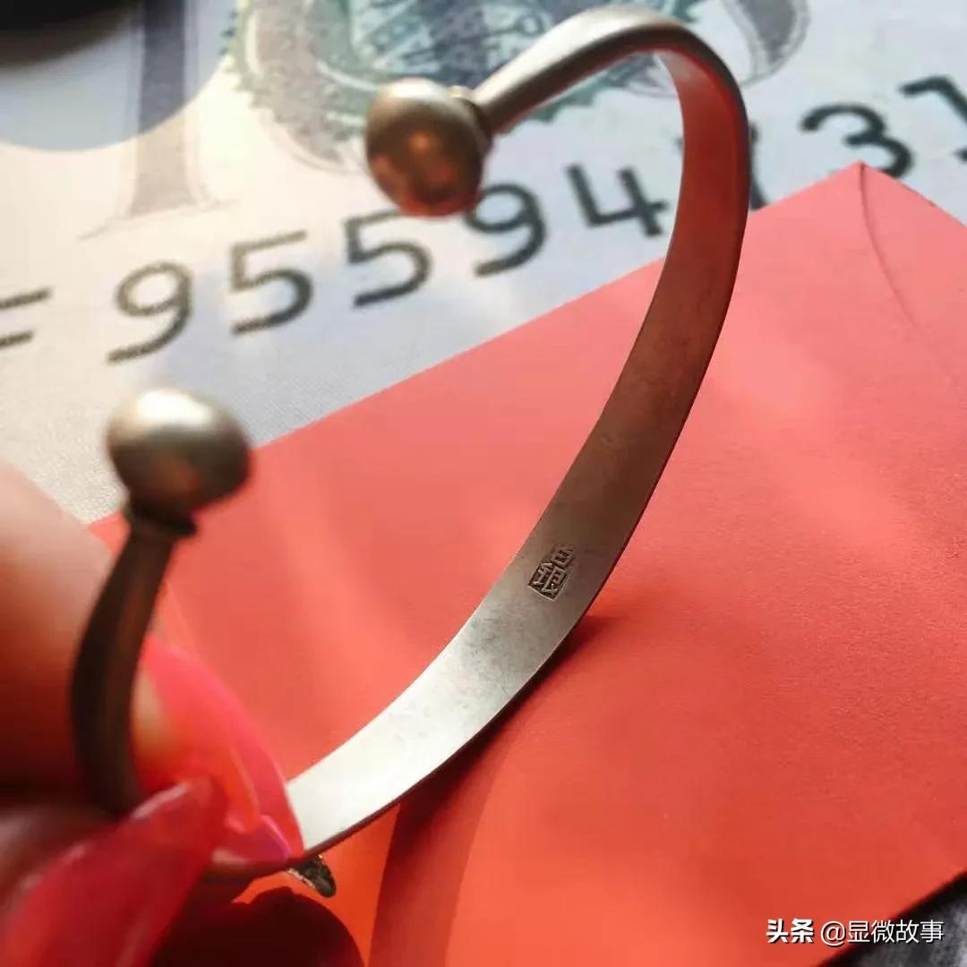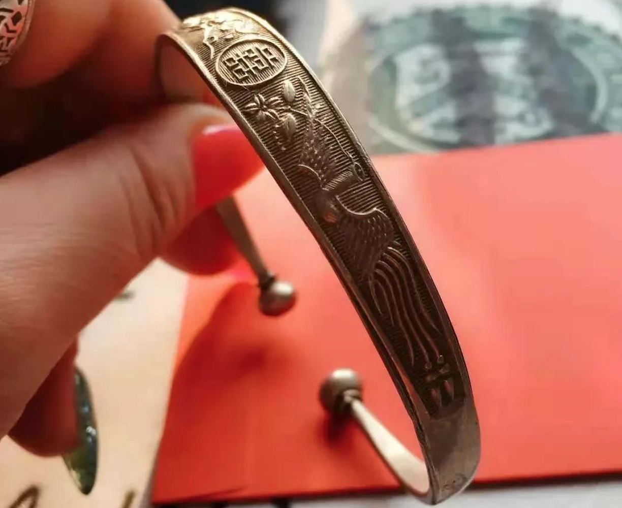 这个银镯纯手工打造,雕花精美,每一个纹理都承载着岁月的痕迹,镯内有足银二字,银子独有的光泽柔和而内敛。