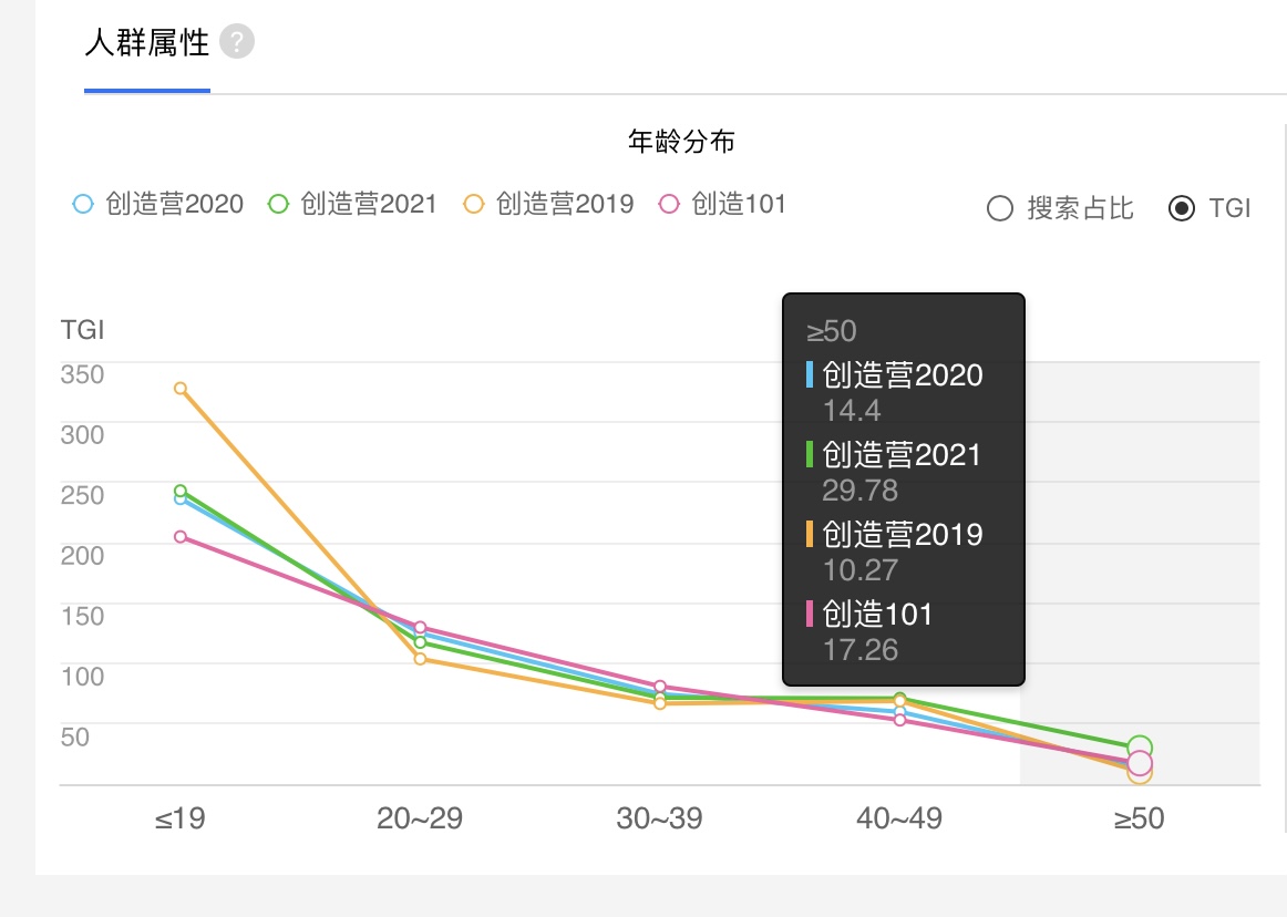 百度指数显示,《创4》在40-49年龄层的TGI达70.89,≥50年龄层为 29.78,皆创系列新高。
