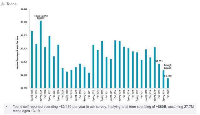 Piper Sandler调查发现,青少年日常年消费金额已经达到了有史以来的最低值,2150美元。在此前的8年里,他们的花费从未低于2371美元,甚至在2006年春天,这个数字曾经越过了3000美金的门槛。