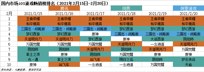 国内市场2021年2月15日—2月20日IOS游戏类畅销榜中,衔接着春节档假期的尾巴,畅销榜略有微调。