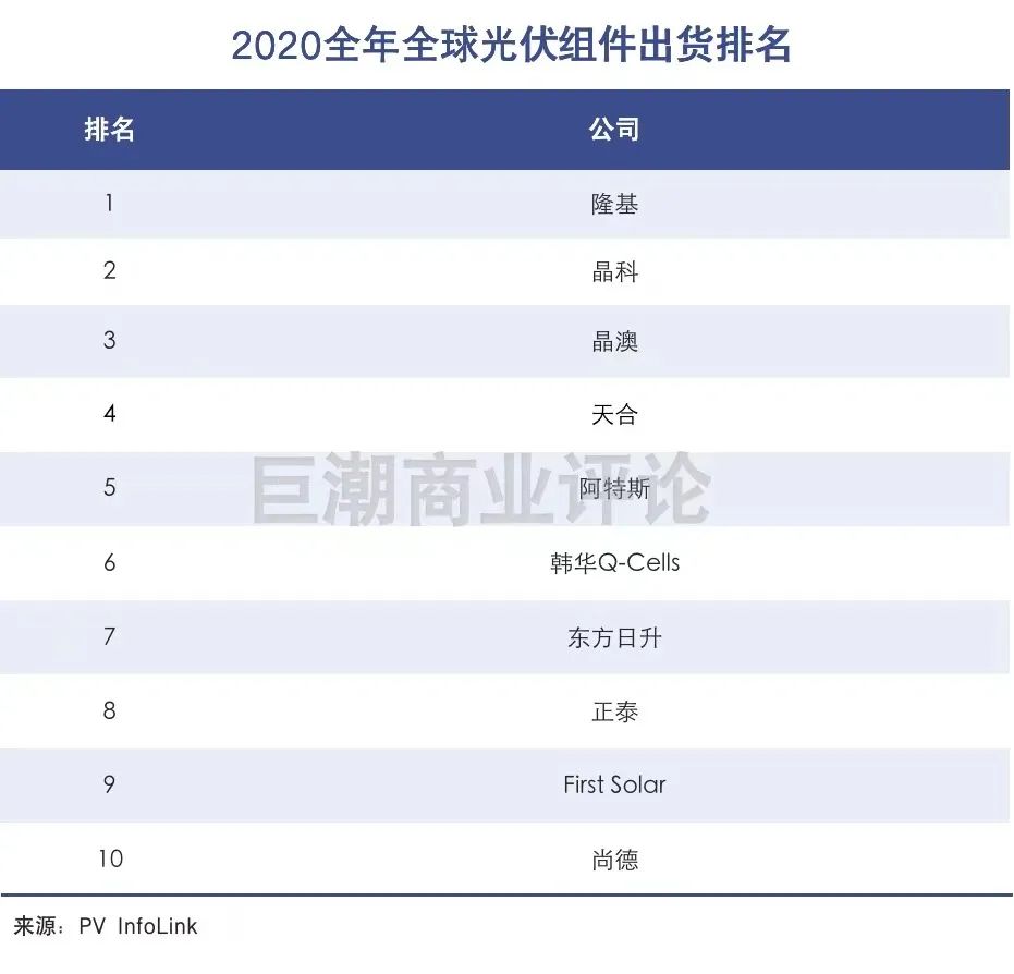 作为全球最大的单晶硅制造商,隆基股份也一直在下游组件领域发力,2020年已经取代了晶科能源,成为全球最大的光伏组件商。