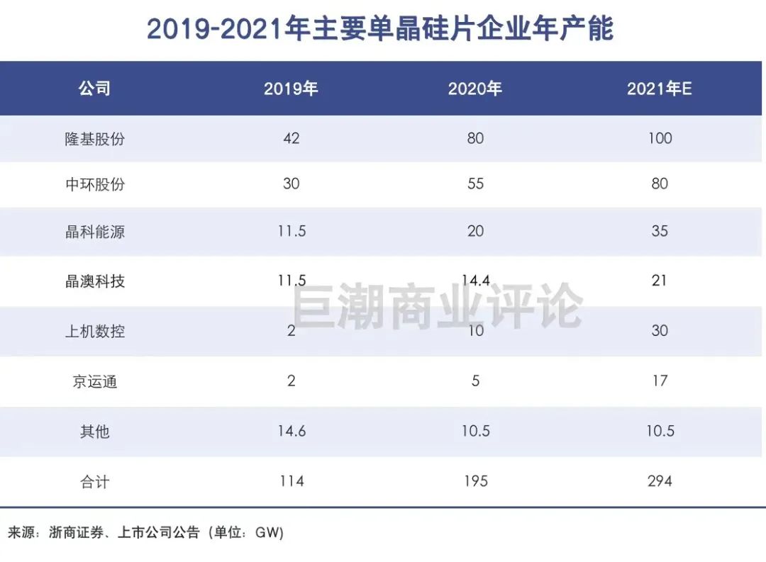 两家企业都在2019年开始拓展单晶硅片业务,同时在2020年继续大规模扩产,试图从隆基、中环寡头垄断的市场中分得一杯羹。