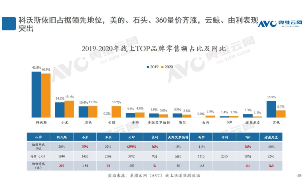 奥维云网数据显现,近两年科沃斯(603486.SH)依旧是市场占有率最高的企业,零售额占比保持在40%之上,小米、石头分列第二、第三位。