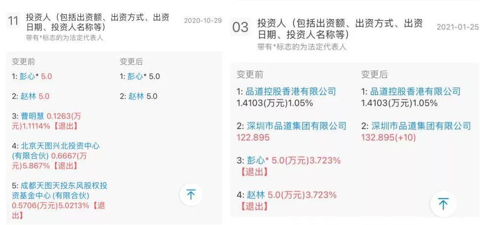 据第三方数据查询机构企查查显示,奈雪的茶经营主体“深圳市品道餐饮管理有限公司”在去年10月29日发生工商变更,股东曹明慧、北京天图兴北投资中心(有限合伙)、成都天图天投东风股权投资基金中心(有限合伙)退出。