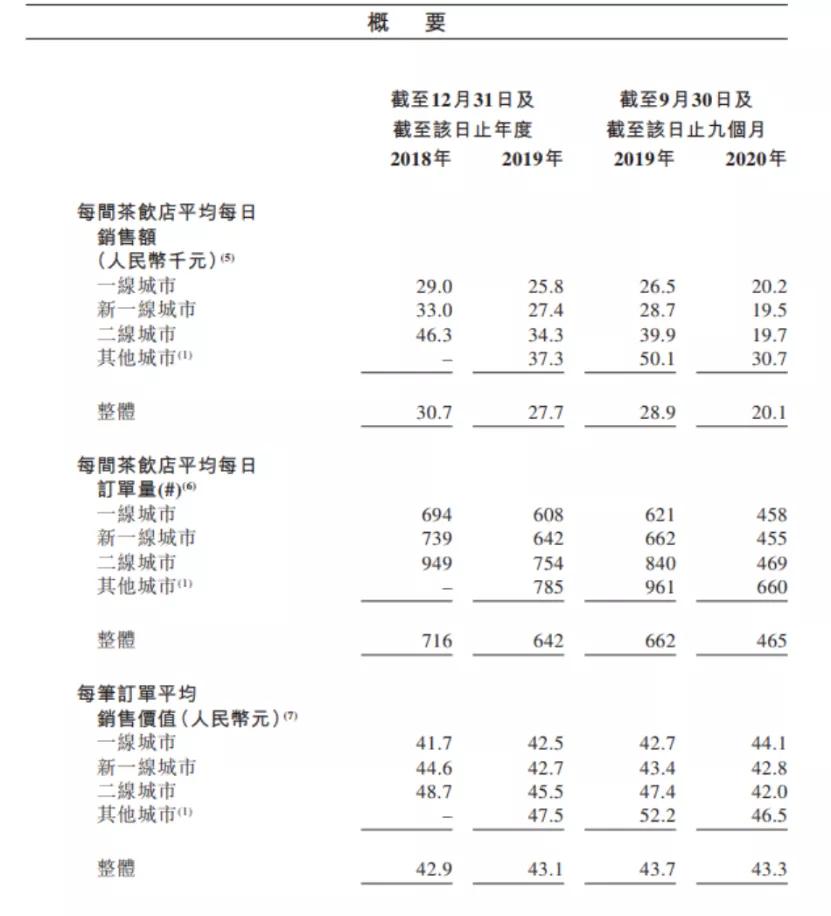 令人堪忧的还有奈雪的茶不断下滑的单店日均订单量和日均销售额,以一线城市为例,其招股书显示:2018年单店日均订单量为694单,到了2019年下降到608单,下降比例达到12.4%;而2020年前三季度的单店日均订单量仅为458单,较上一年同期的621单,跌幅达到了26.2%