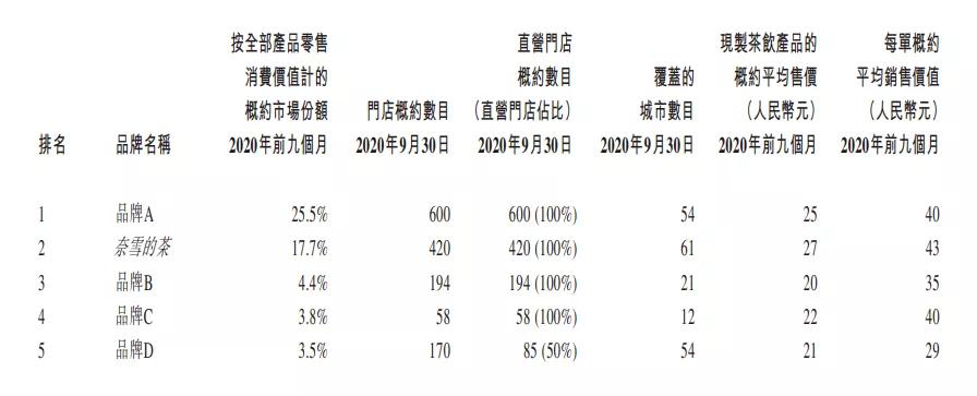 在其招股书中承认,高端现制茶饮中的老大是市占率达到25.5%的“品牌A”,而从门店数量、覆盖城市、平均售价等维度来看,几乎可以断定“品牌A”即为喜茶。